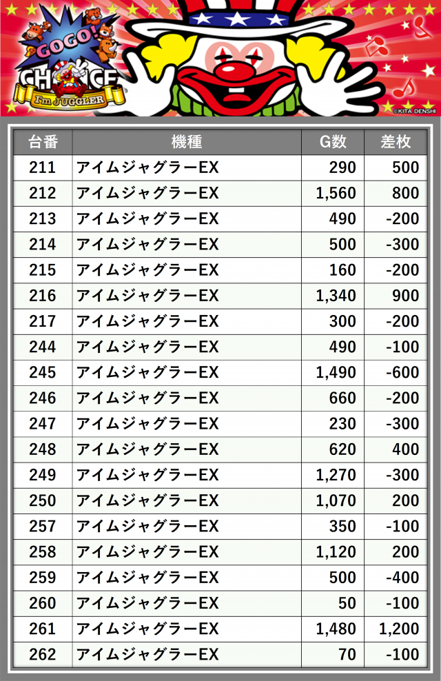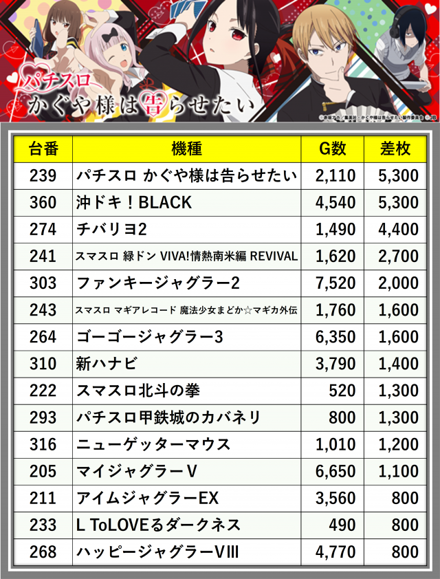 ※差枚数順に掲載しています