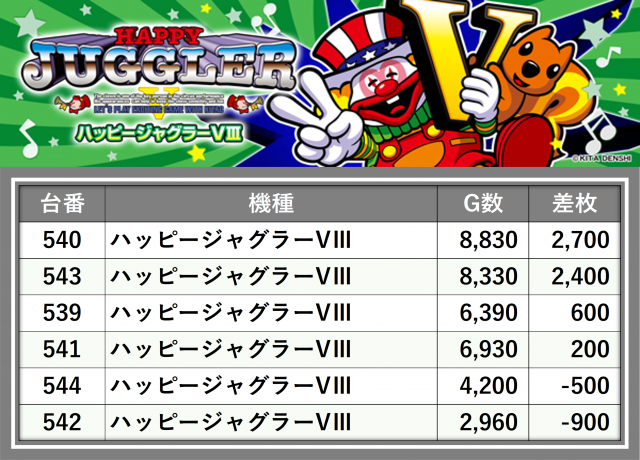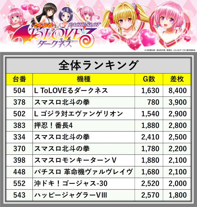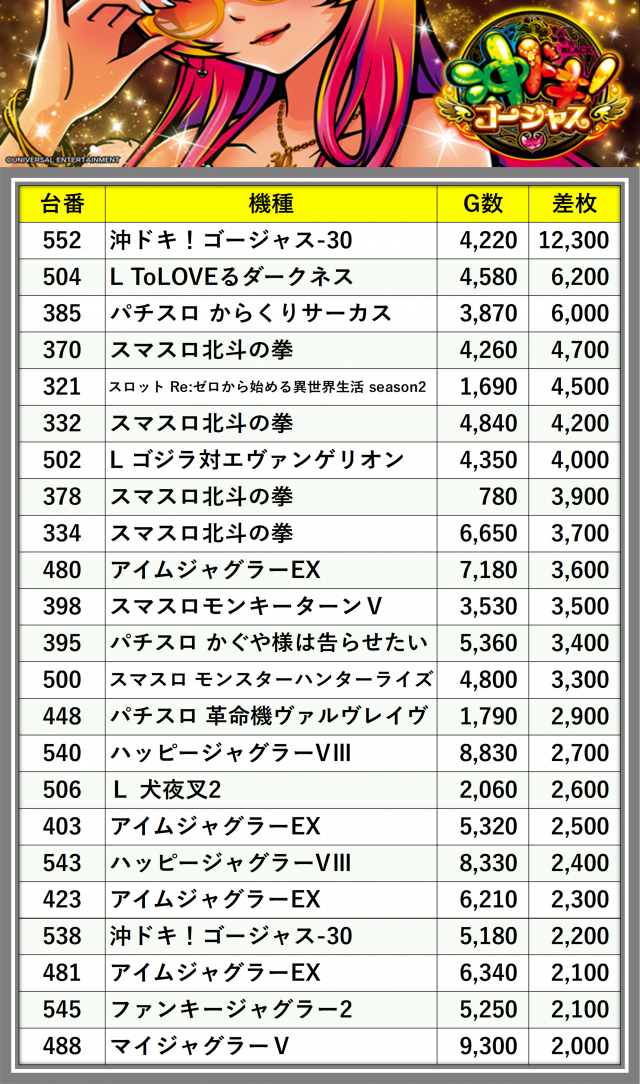 厳選された取材対象機種をはじめ、その他スロット全体から好記録が飛び出した!プレイヤーが楽しんだ1日を下記データにて振り返ってみて欲しい。