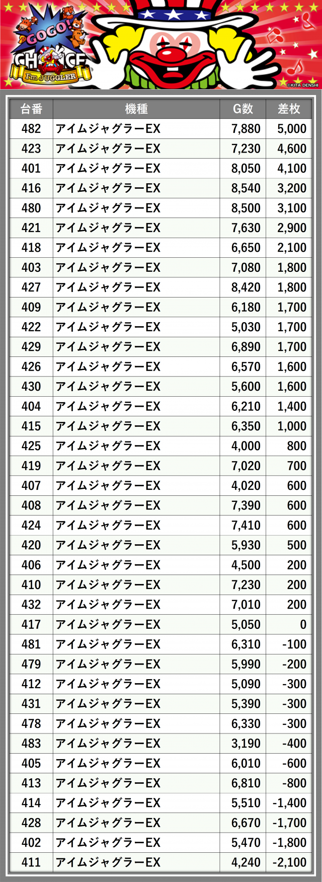 ※差枚数順に掲載しています