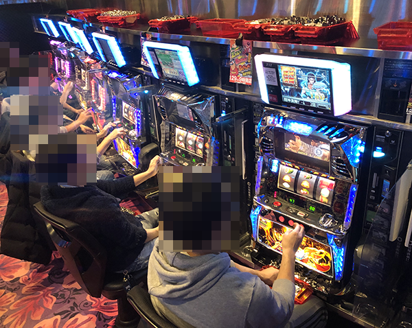設置台数が17台と多いにもかかわらず、ほぼフル稼働。うれしそうにレバーを叩く姿がズラリと並んでいる光景は壮観だ。