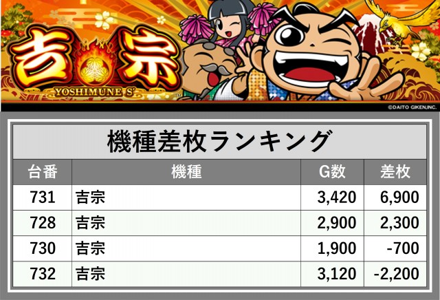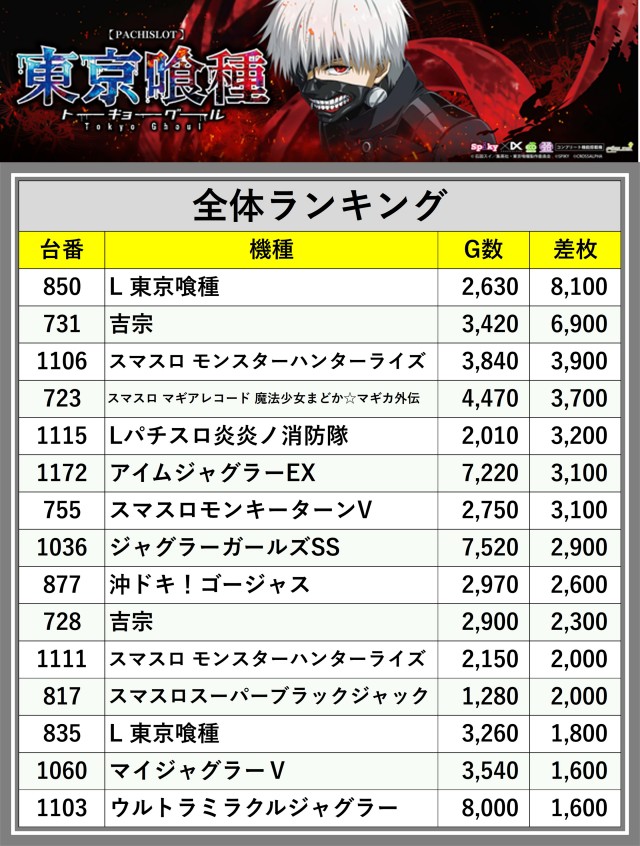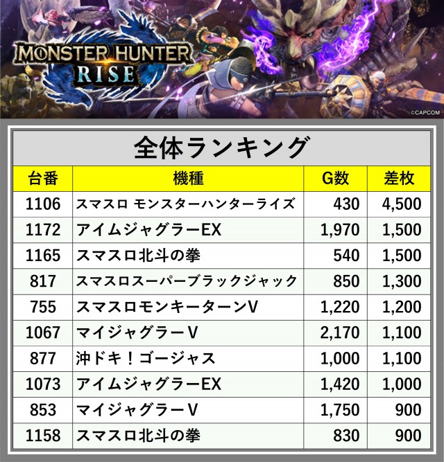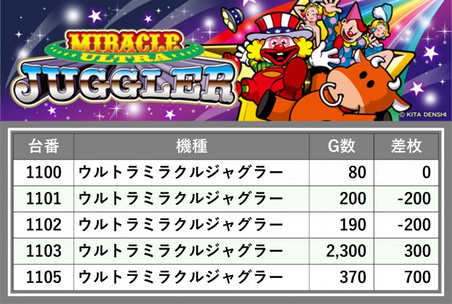 厳選された取材対象機種をはじめ、その他スロット全体から好記録が飛び出した!プレイヤーが楽しんだ1日を下記データにて振り返ってみて欲しい。