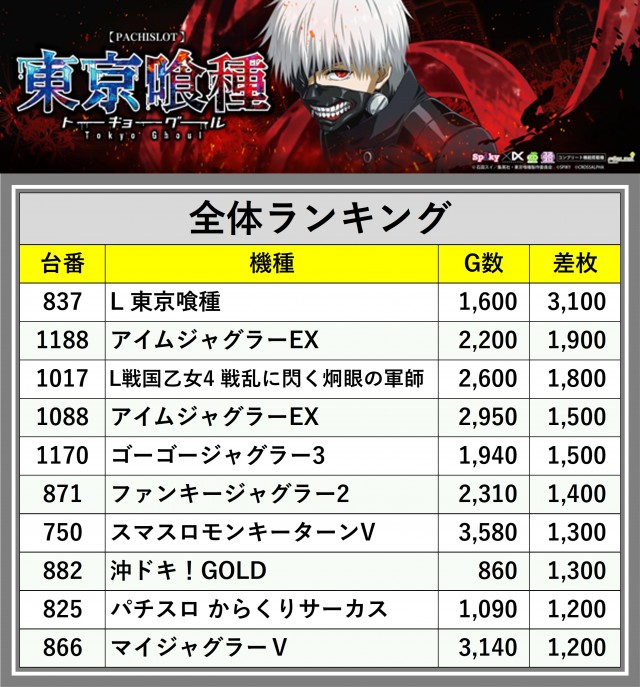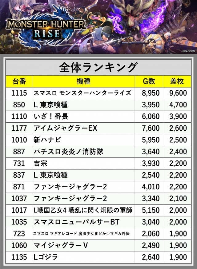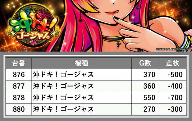 厳選された取材対象機種をはじめ、その他スロット全体から好記録が飛び出した!プレイヤーが楽しんだ1日を下記データにて振り返ってみて欲しい。