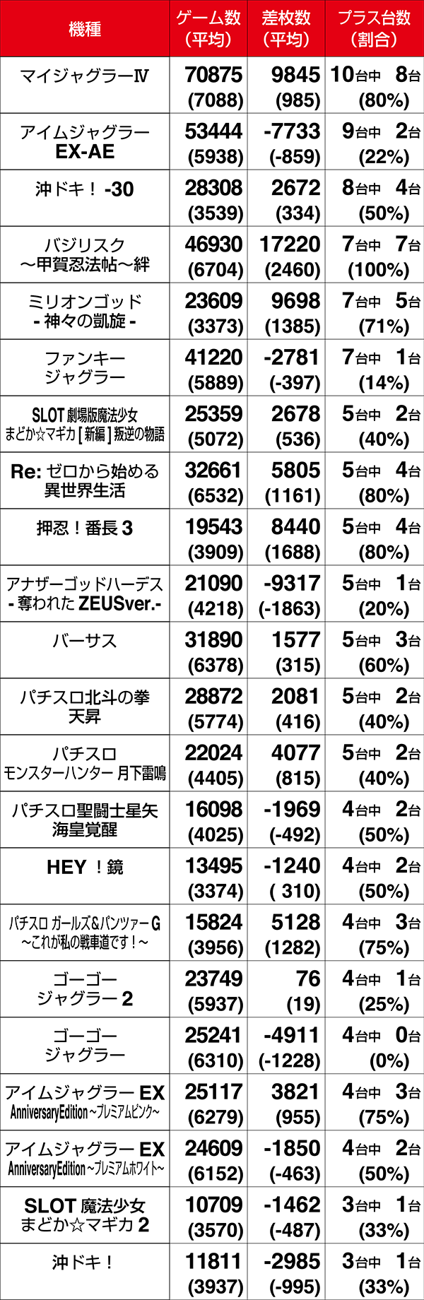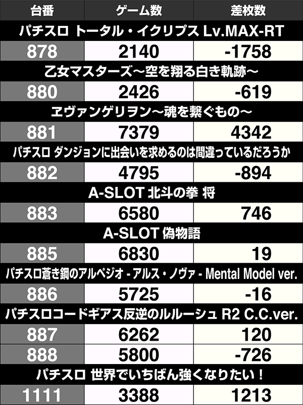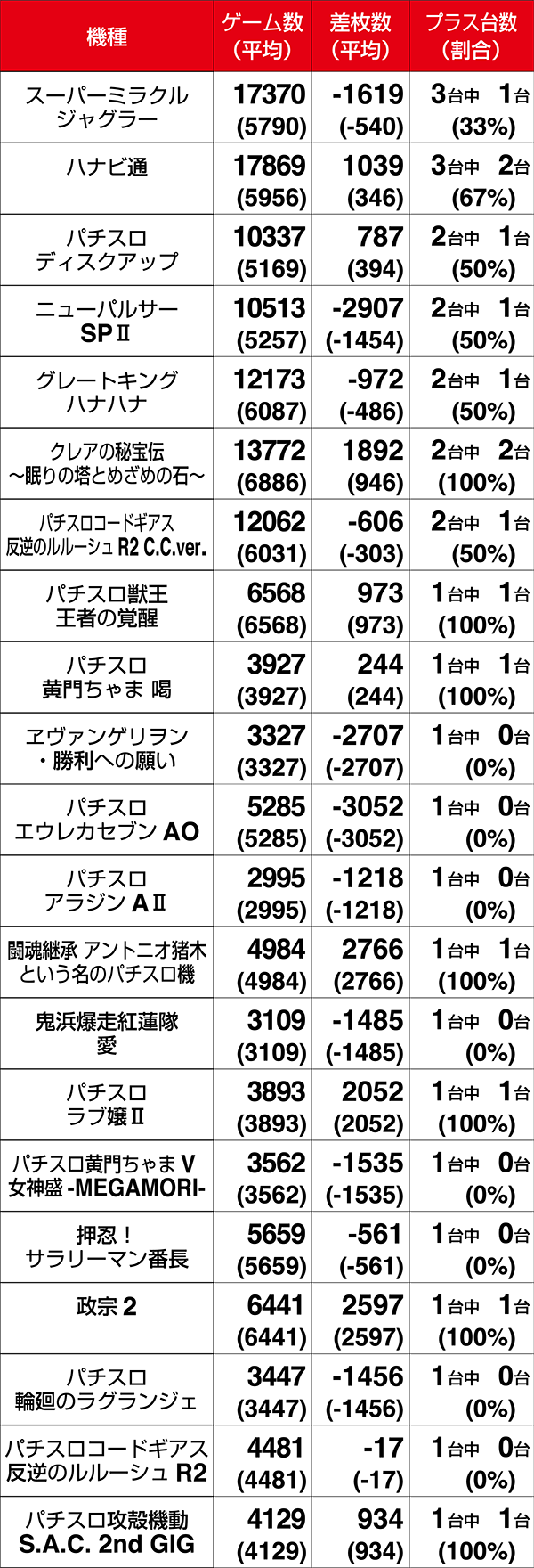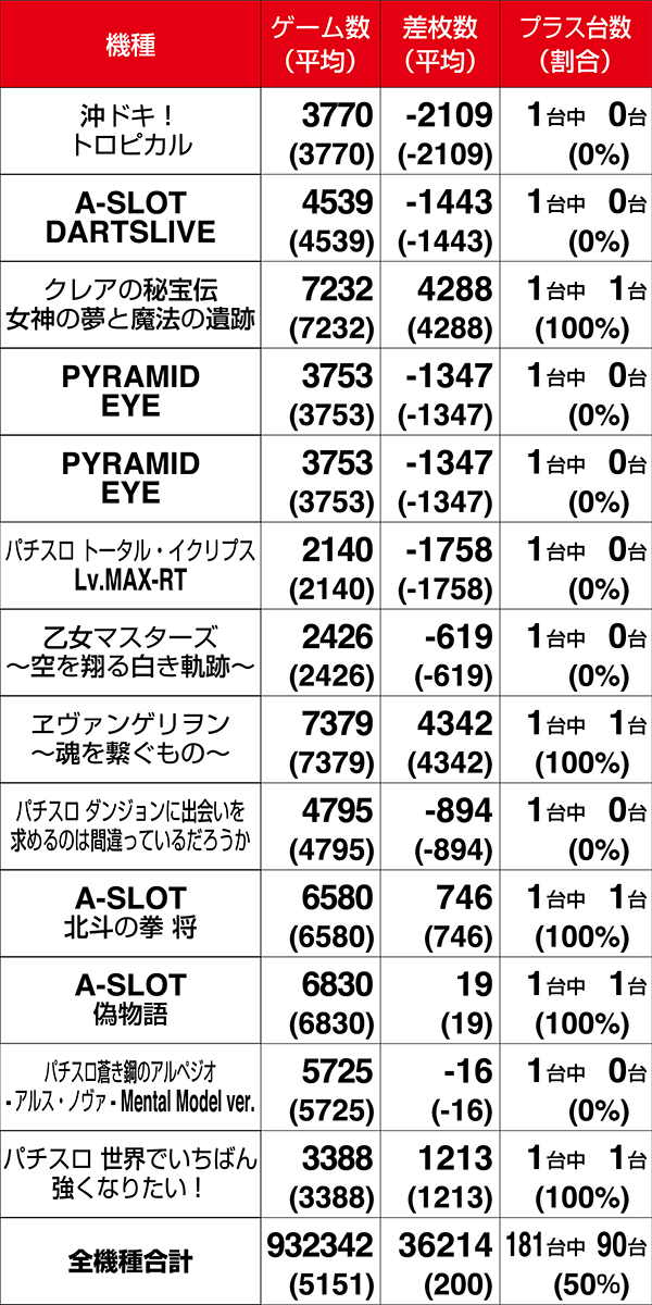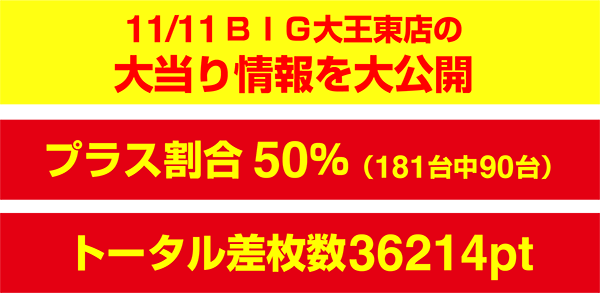 11月11日の「BIG大王東店」のパチスロは181台のうち、半数にあたる90台がプラスを記録。