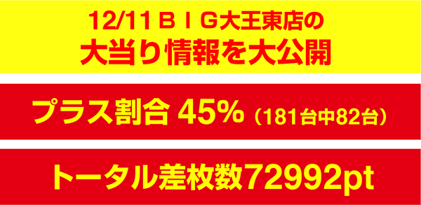 12月11日の「BIG大王東店」は、パチスロ全体で181台中82台がプラス差枚数を記録。