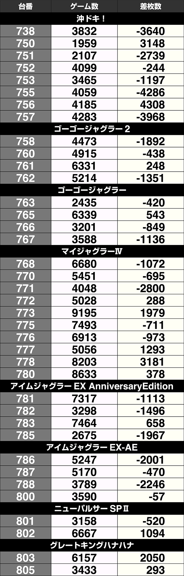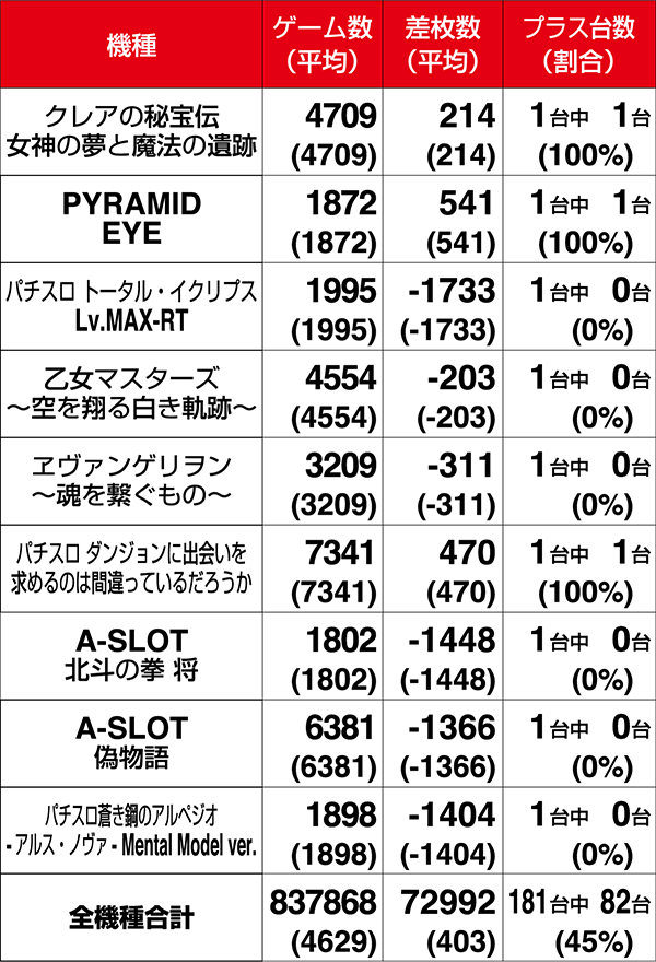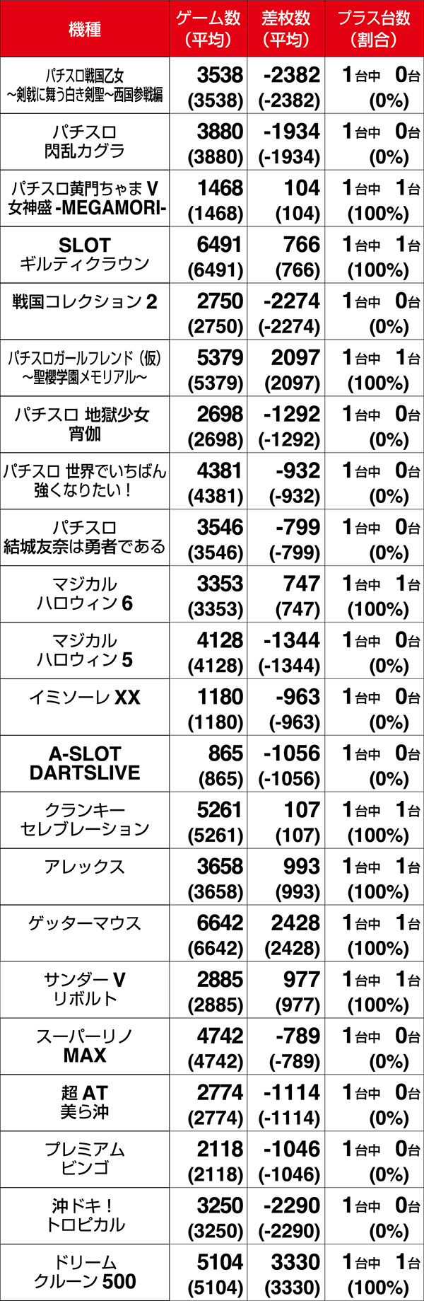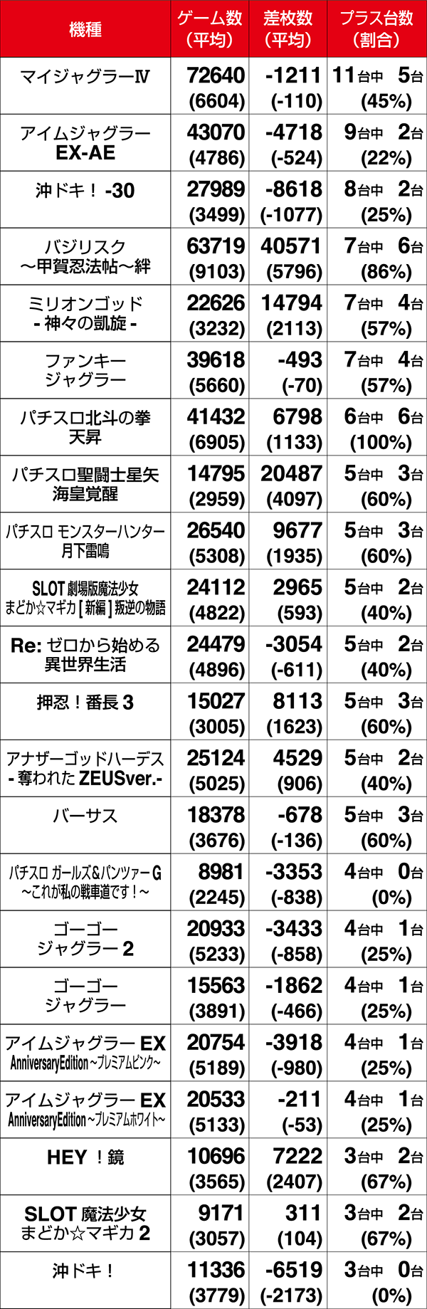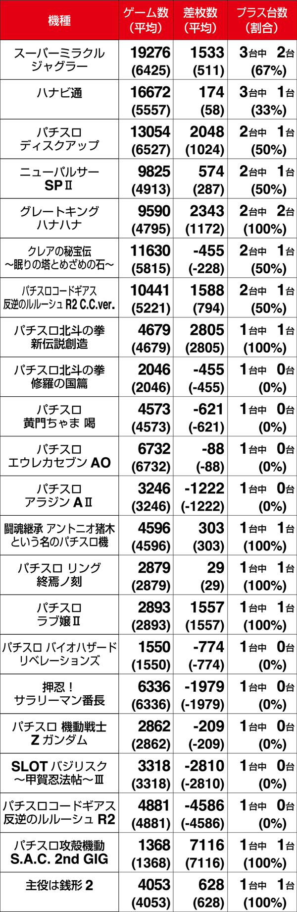 1機種のみの機種は46機種中18機種がプラス。2台以上設置されている機種は29機種あり、そのうちの16機種がプラス差枚数を記録した。