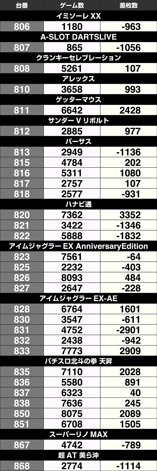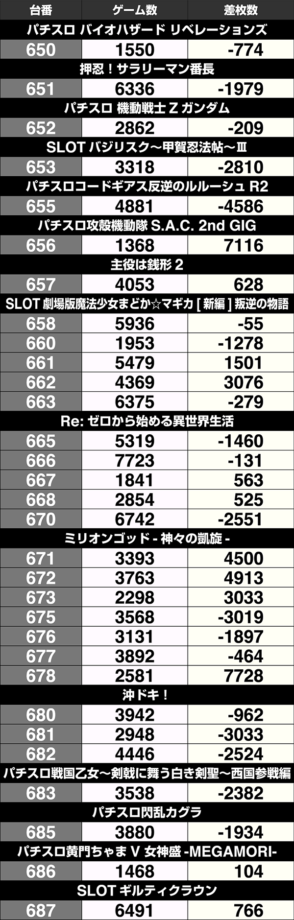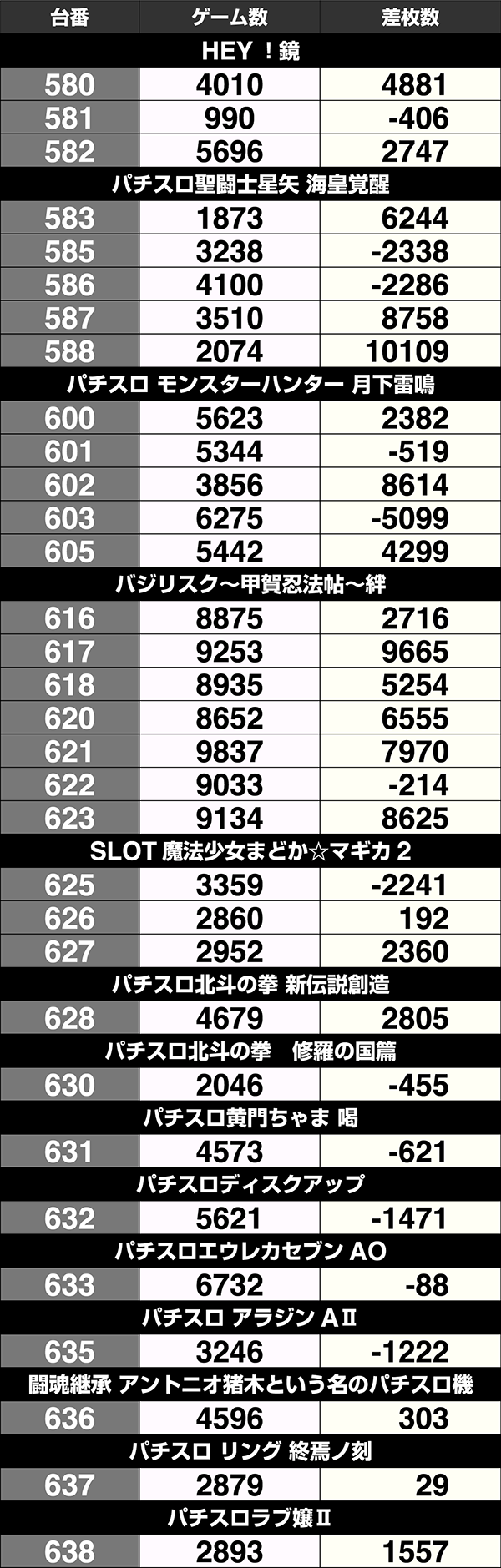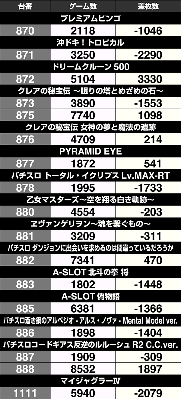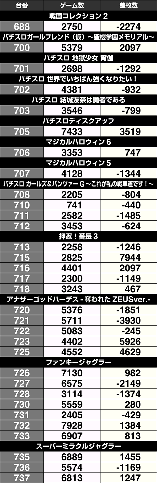 1機種のみの機種は46機種中18機種がプラス。2台以上設置されている機種は29機種あり、そのうちの16機種がプラス差枚数を記録した。