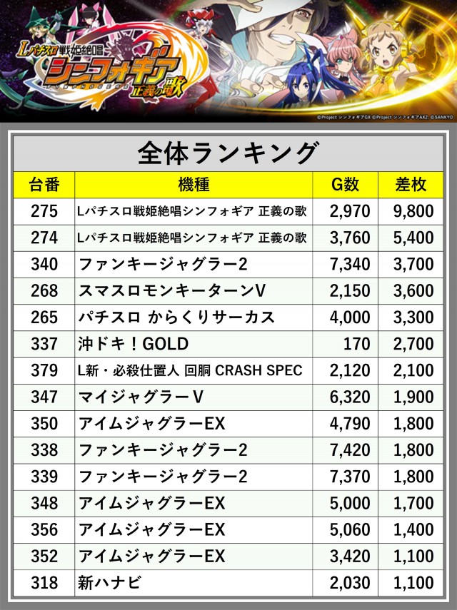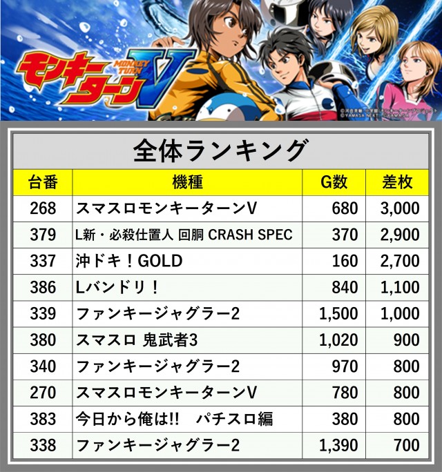厳選された取材対象機種をはじめ、その他スロット全体から好記録が飛び出した!プレイヤーが楽しんだ1日を下記データにて振り返ってみて欲しい。