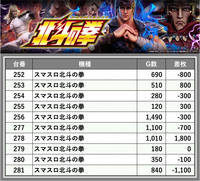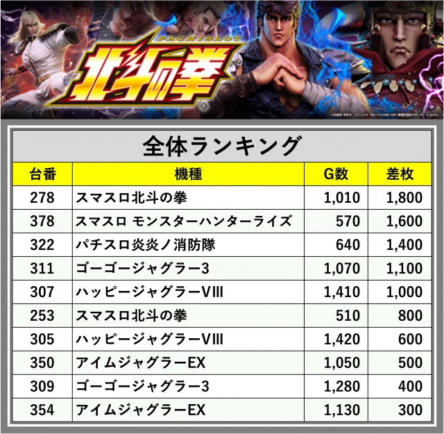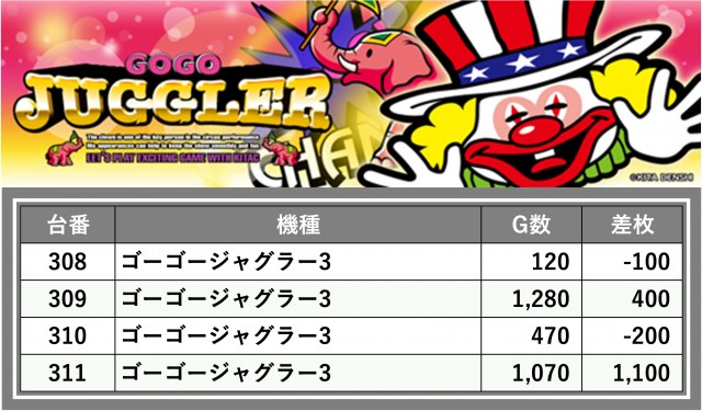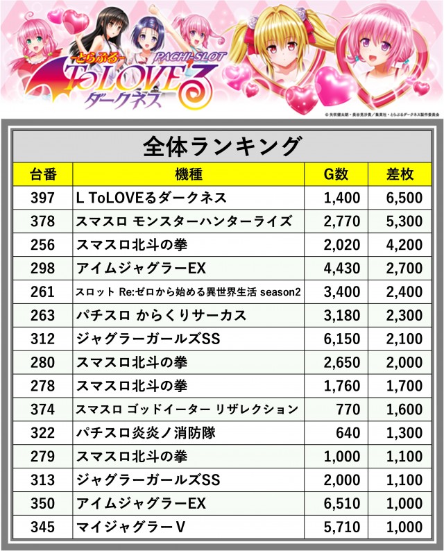 厳選された取材対象機種をはじめ、その他スロット全体から好記録が飛び出した!プレイヤーが楽しんだ1日を下記データにて振り返ってみて欲しい。