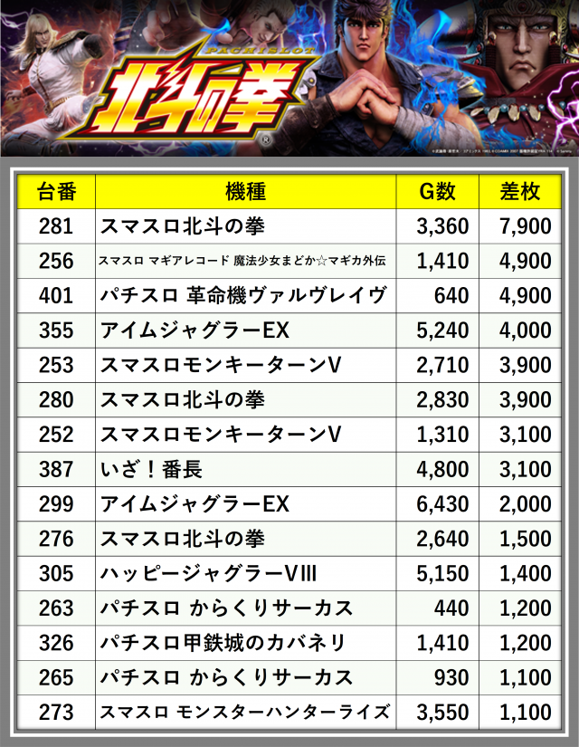 厳選された取材対象機種をはじめ、その他スロット全体から好記録が飛び出した!プレイヤーが楽しんだ1日を下記データにて振り返ってみて欲しい。