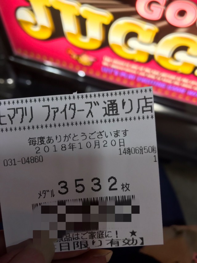 まず個人結果は、『ミリオンゴッド-神々の凱旋-』の3532枚と、『ゴーゴージャグラー』で獲得した523枚を合わせて、4055枚でした。