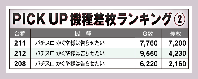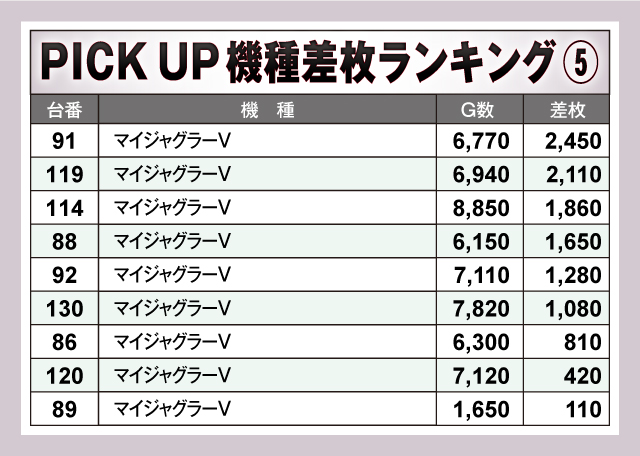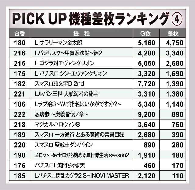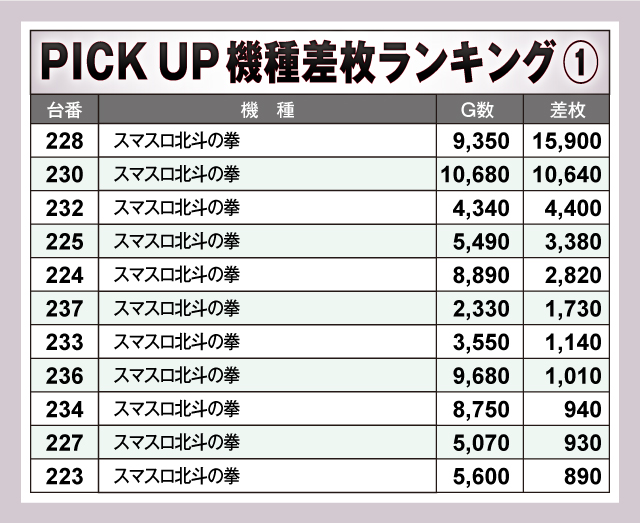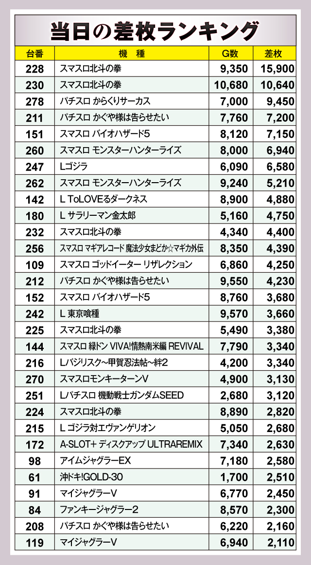 まずは差枚ランキングのチェックから。30台すべてが差枚+2,000枚オーバーで、+3,000枚オーバーは21台出現。それらのなかでもっとも優秀だったのは、228番台の「スマスロ北斗の拳」で、差枚は大台突破の+15,900枚の調記録をマーク! その他ランクイン機種をチェックしてみると、人気スマスロ機種からジャグラーシリーズ、少数設置機種まで幅広い機種がランクイン! 訪れたファンたちが存分に楽しめる環境が整っていたようだ!