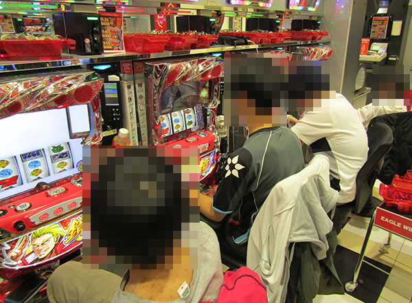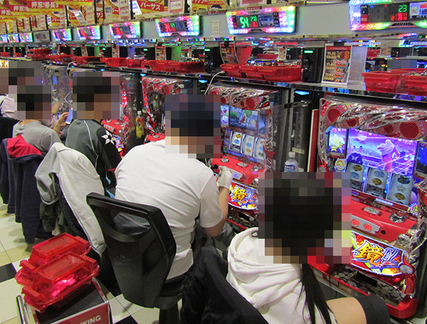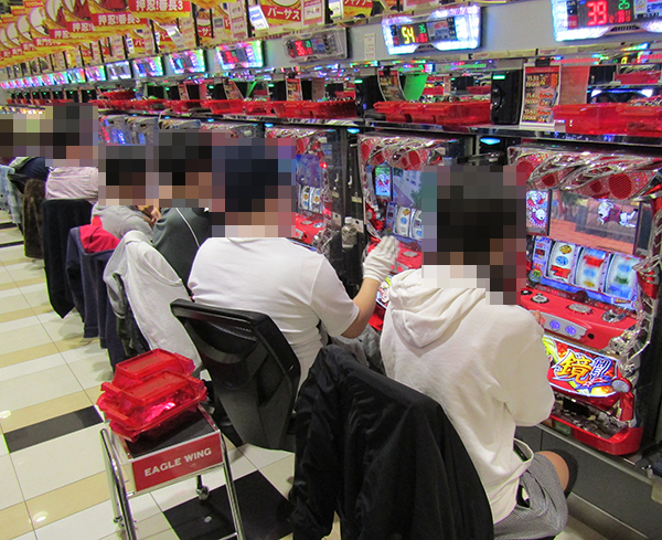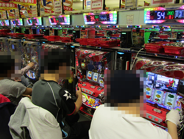 談笑しながら遊技をおこなっているプレイヤーの姿も確認。明るい空間で遊技が楽しめることも、このホールにおける魅力のひとつなのだろう。