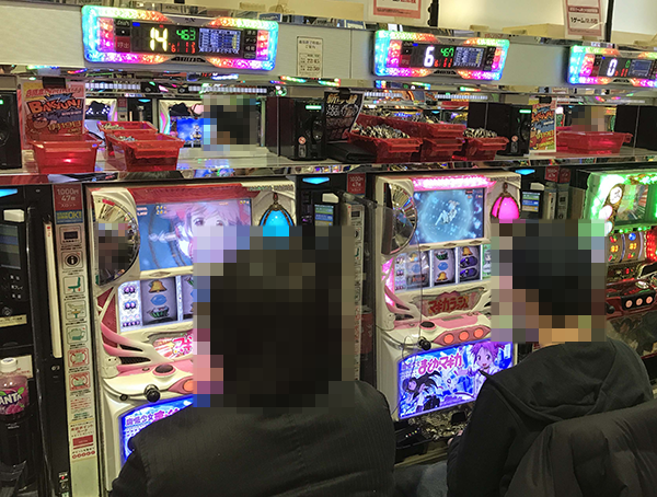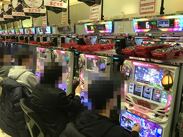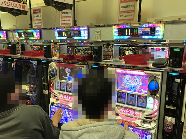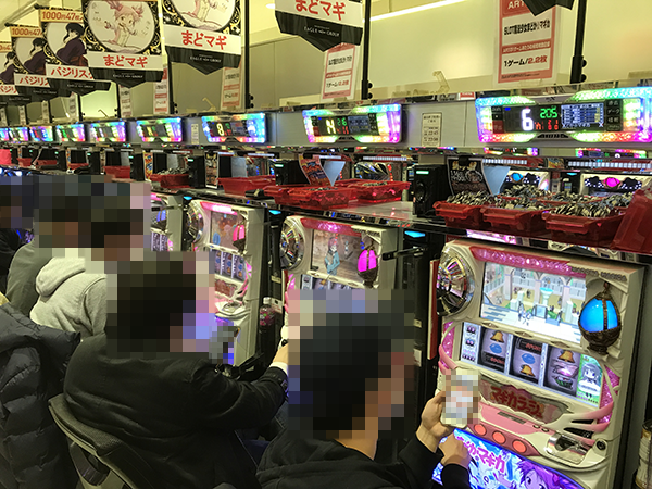 パチスロコーナーを進んでいくと、さまざまな機種がプレイヤーの笑顔で彩られていた。