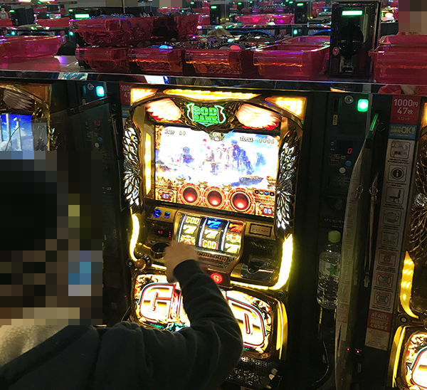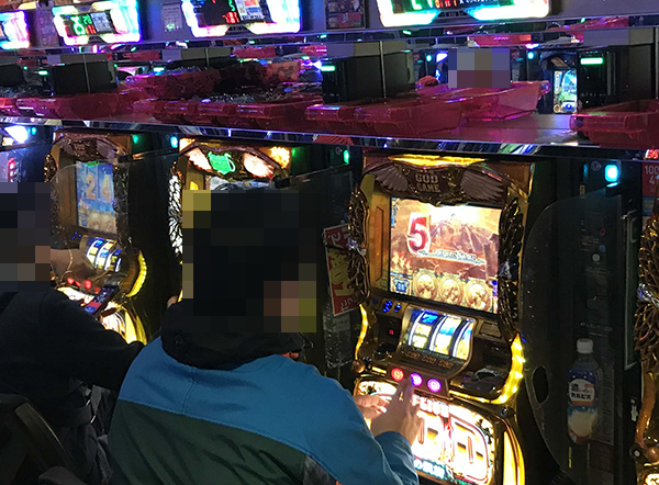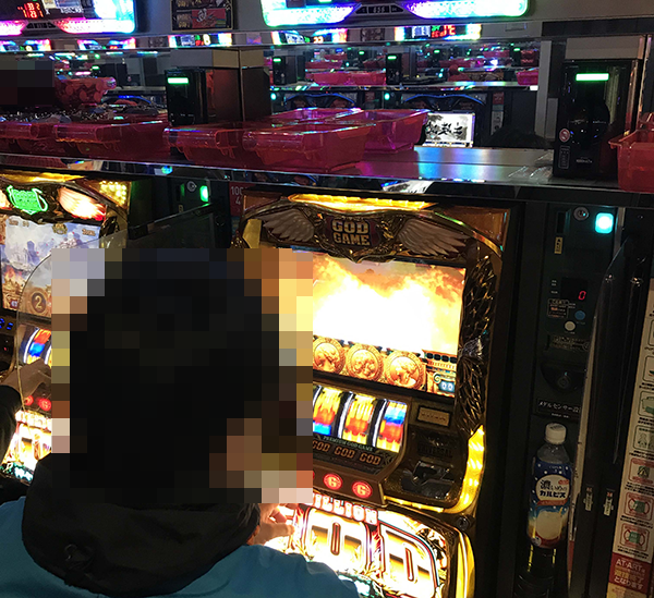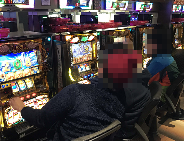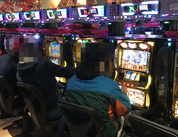 うれしそうにレバーを叩いているシーンもあるなど、パチスロコーナーを調査していくなかで、ひときわ目立っていたことを覚えている。