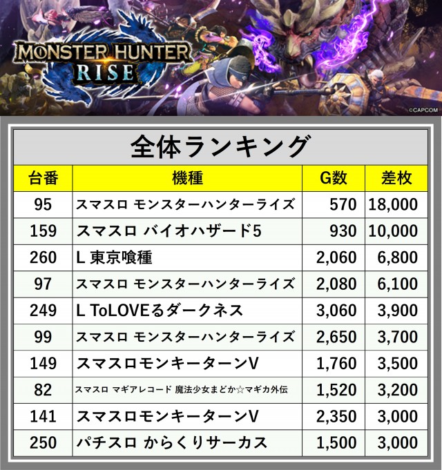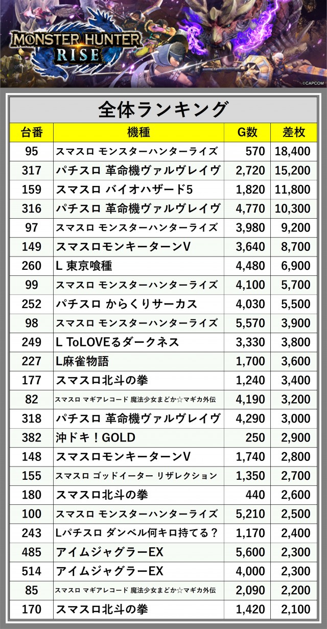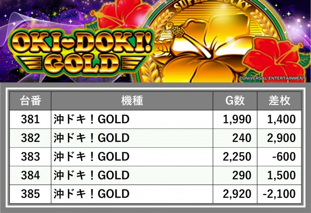 厳選された取材対象機種をはじめ、その他スロット全体から好記録が飛び出した!プレイヤーが楽しんだ1日を下記データにて振り返ってみて欲しい。