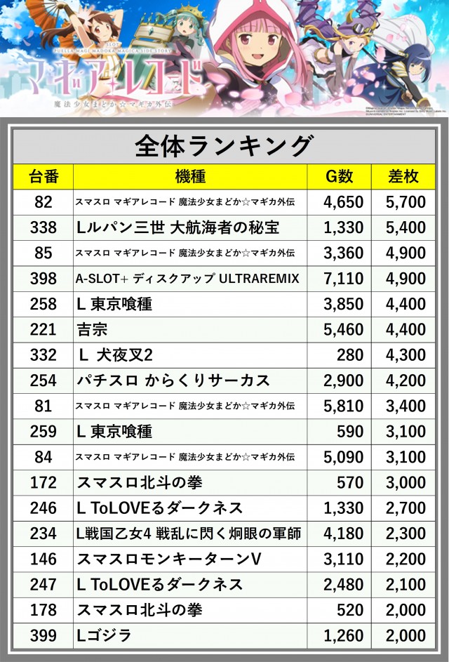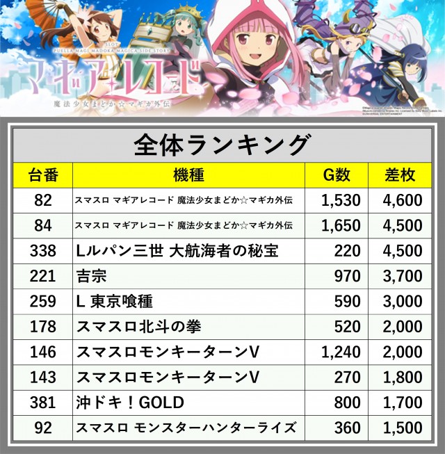 厳選された取材対象機種をはじめ、その他スロット全体から好記録が飛び出した!プレイヤーが楽しんだ1日を下記データにて振り返ってみて欲しい。