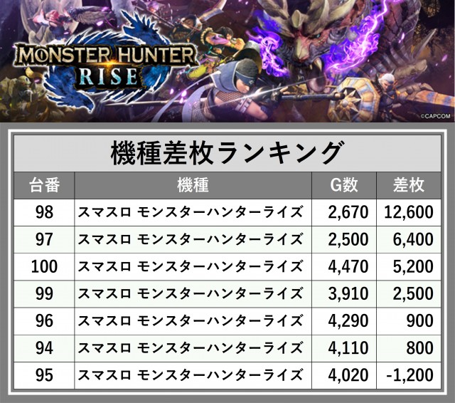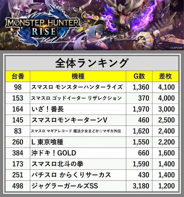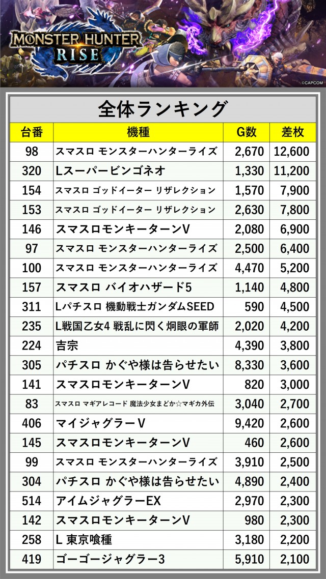 厳選された取材対象機種をはじめ、その他スロット全体から好記録が飛び出した!プレイヤーが楽しんだ1日を下記データにて振り返ってみて欲しい。