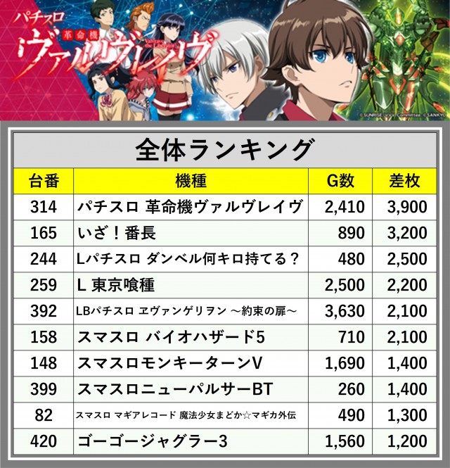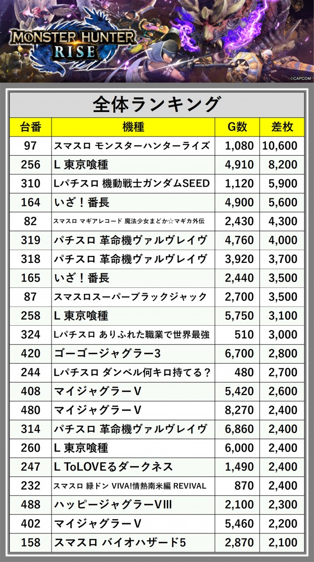厳選された取材対象機種をはじめ、その他スロット全体から好記録が飛び出した!プレイヤーが楽しんだ1日を下記データにて振り返ってみて欲しい。