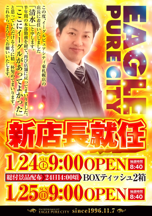 1月24日(土)あさ9開店‼新店長就任&総付景品配布‼