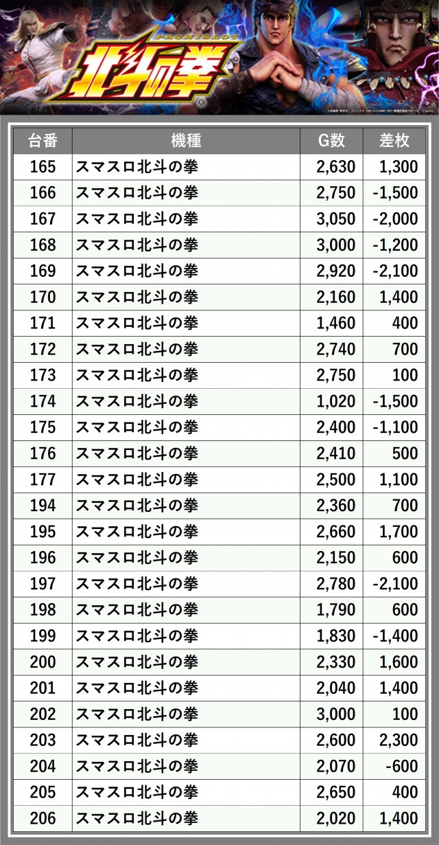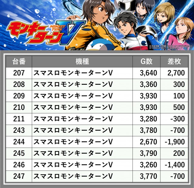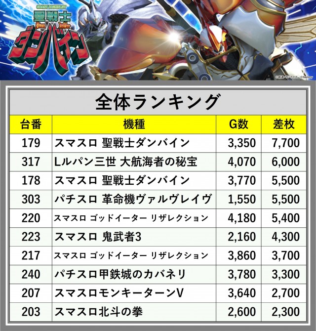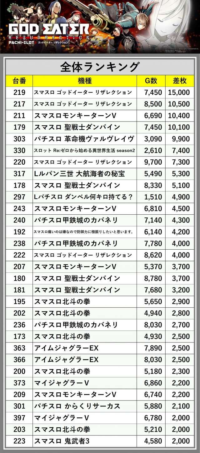 厳選された取材対象機種をはじめ、その他スロット全体から好記録が飛び出した!プレイヤーが楽しんだ1日を下記データにて振り返ってみて欲しい。