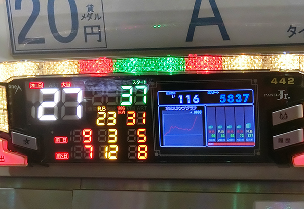 また、小役カウンターを使用するプレイヤーや1/116といったボーナス合算確率が表示されたデータカウンターも目にした。