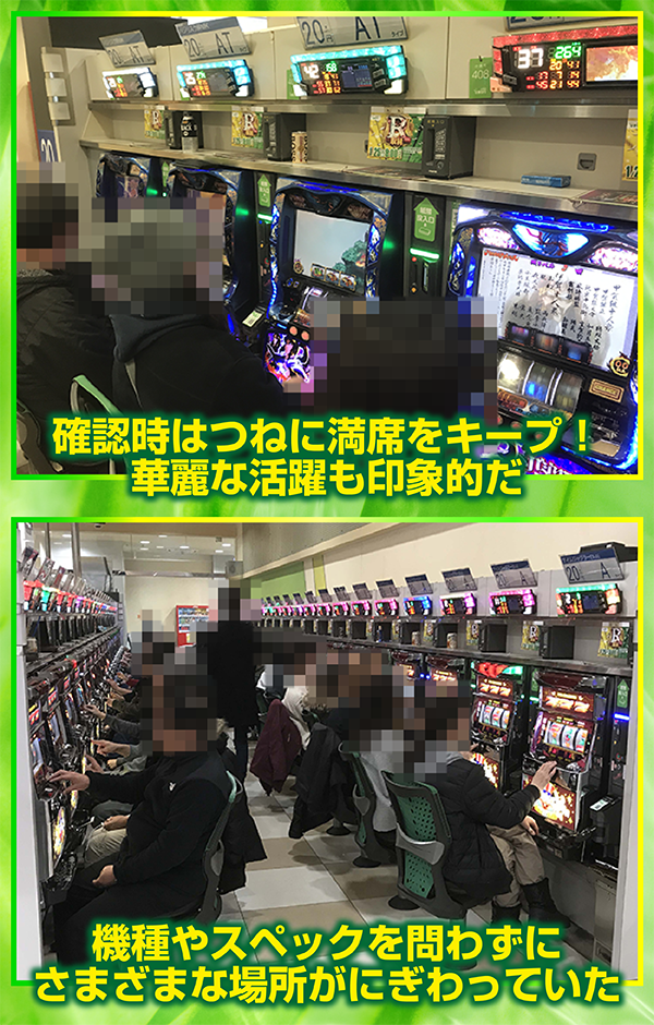 20円パチスロの「バジリスク~甲賀忍法帖~絆」や「沖ドキ!」などで、華麗なパフォーマンスを披露するプレイヤーの姿がみられた。