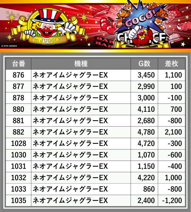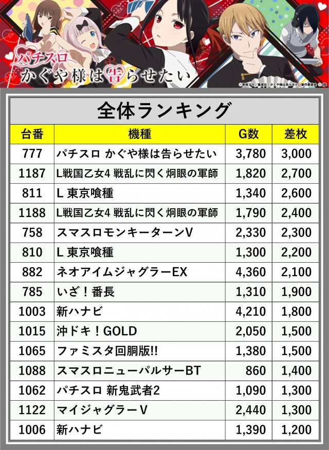 厳選された取材対象機種をはじめ、その他スロット全体から好記録が飛び出した!プレイヤーが楽しんだ1日を下記データにて振り返ってみて欲しい。