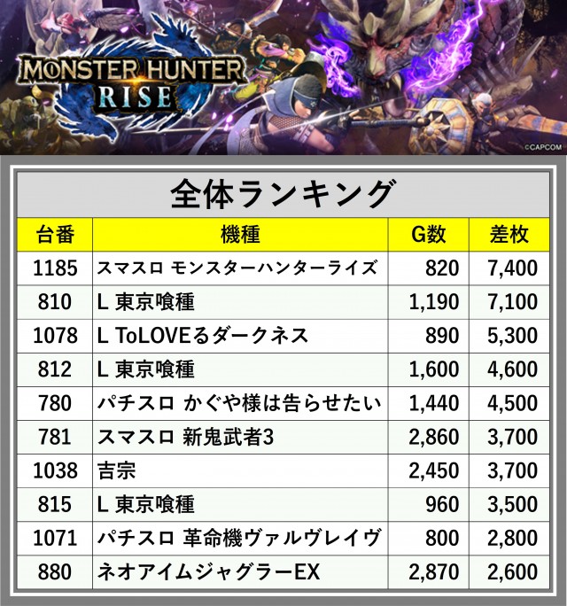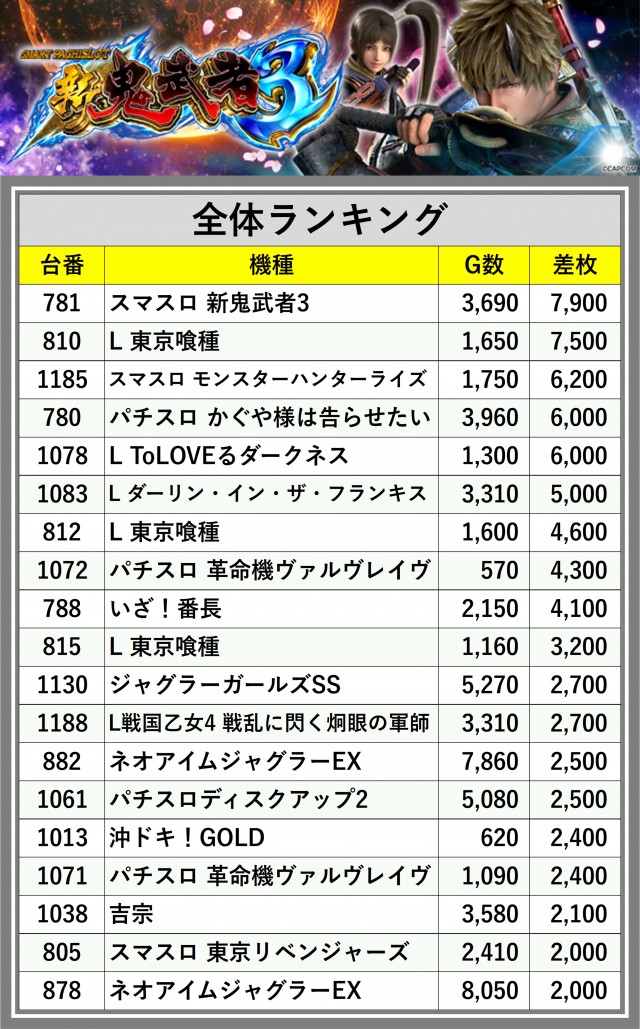 ※差枚数順に掲載しています