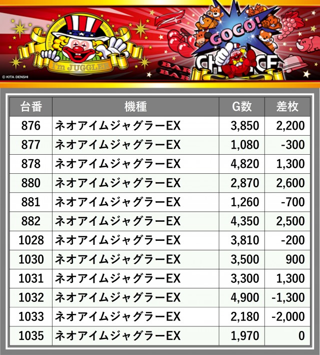厳選された取材対象機種をはじめ、その他スロット全体から好記録が飛び出した!プレイヤーが楽しんだ1日を下記データにて振り返ってみて欲しい。