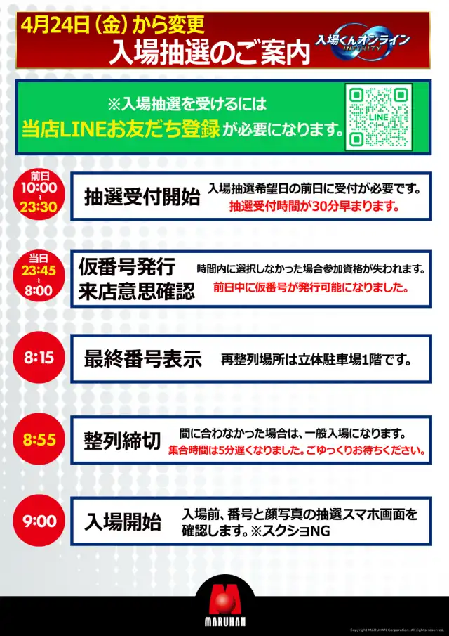 抽選WEB受付:前日10:00~24:00 来店意思確認:8:00締切 整列締切:開店の10分前 |