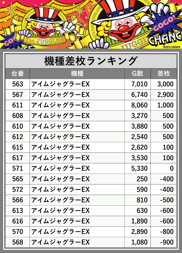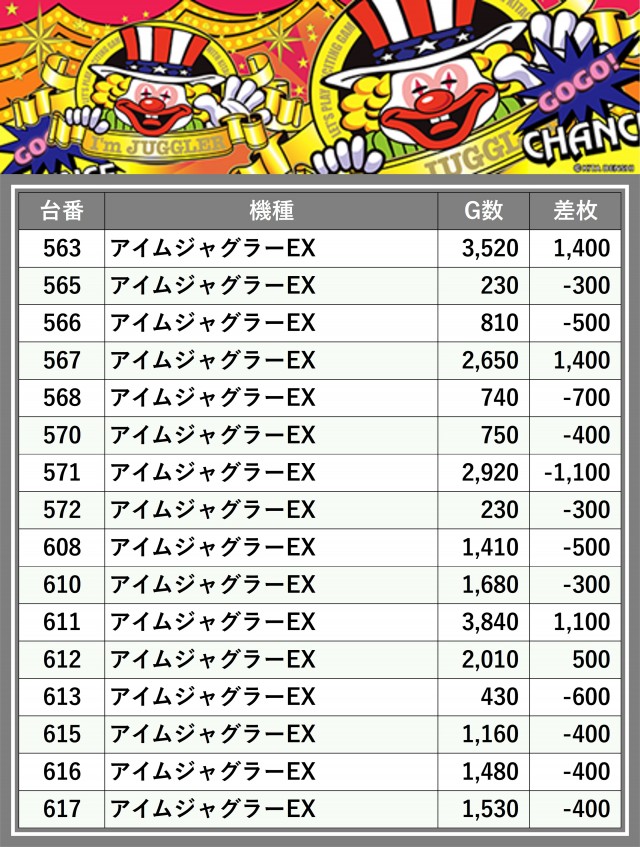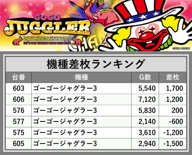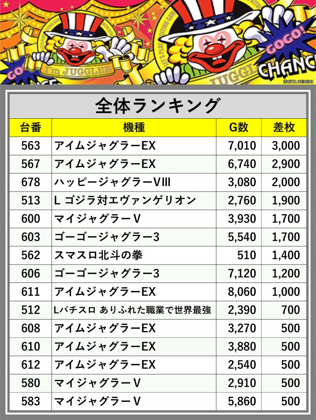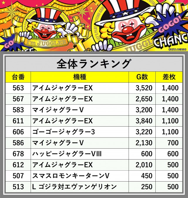 厳選された取材対象機種をはじめ、その他スロット全体から好記録が飛び出した!プレイヤーが楽しんだ1日を下記データにて振り返ってみて欲しい。