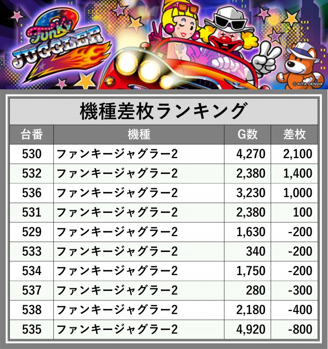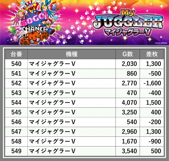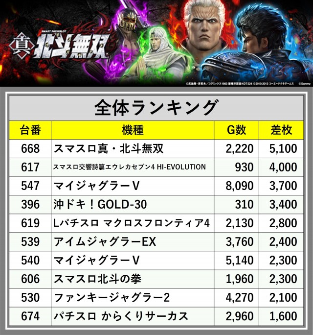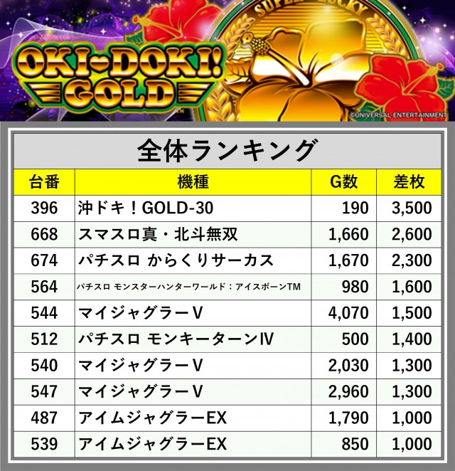 厳選された取材対象機種をはじめ、その他スロット全体から好記録が飛び出した!プレイヤーが楽しんだ1日を下記データにて振り返ってみて欲しい。