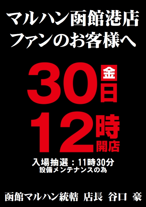 7月30日(金)12時開店 入場抽選は11時30分からです!