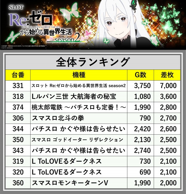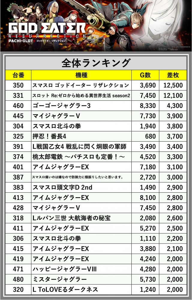 ※差枚数順に掲載しています