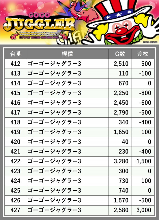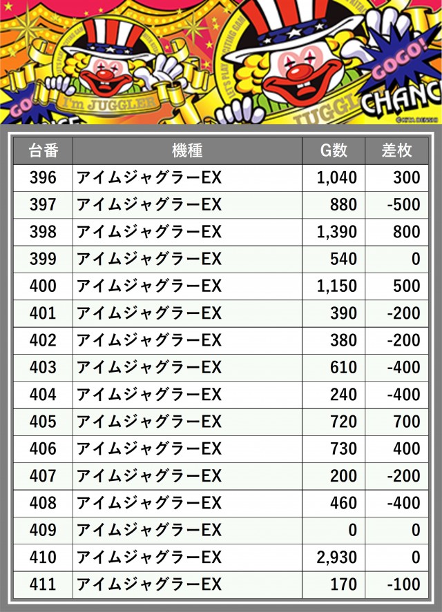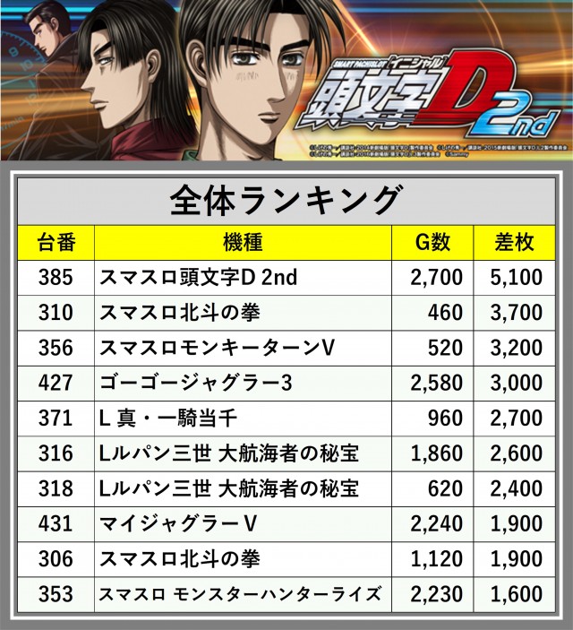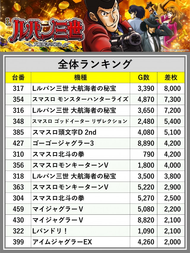 厳選された取材対象機種をはじめ、その他スロット全体から好記録が飛び出した!プレイヤーが楽しんだ1日を下記データにて振り返ってみて欲しい。