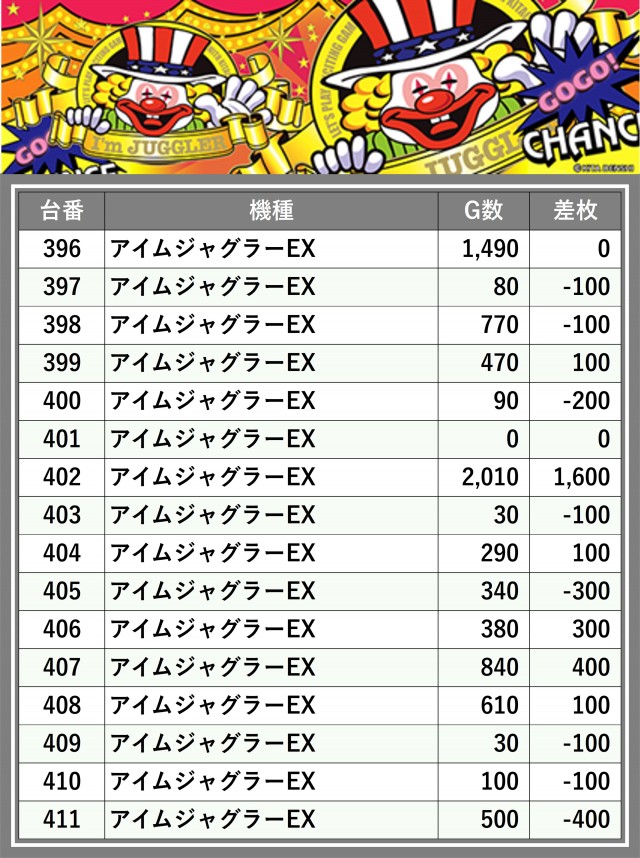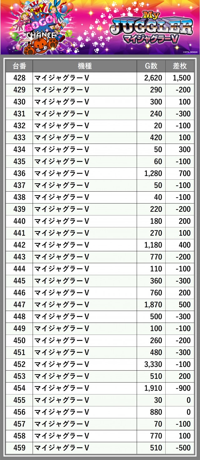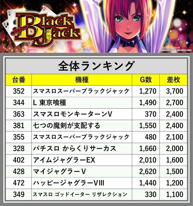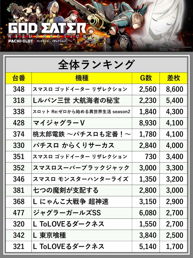 厳選された取材対象機種をはじめ、その他スロット全体から好記録が飛び出した!プレイヤーが楽しんだ1日を下記データにて振り返ってみて欲しい。