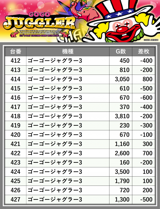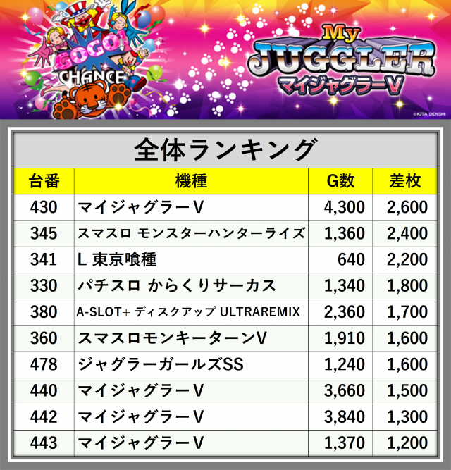 厳選された取材対象機種をはじめ、その他スロット全体から好記録が飛び出した!プレイヤーが楽しんだ1日を下記データにて振り返ってみて欲しい。