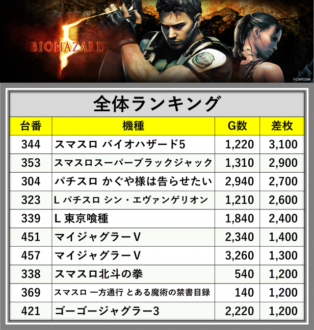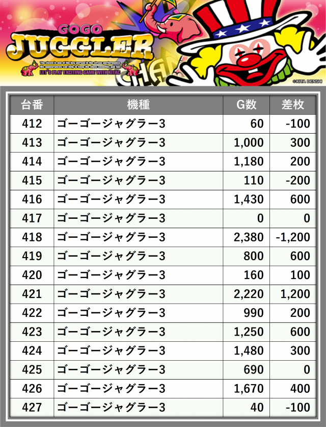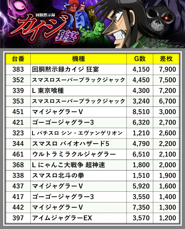 厳選された取材対象機種をはじめ、その他スロット全体から好記録が飛び出した!プレイヤーが楽しんだ1日を下記データにて振り返ってみて欲しい。