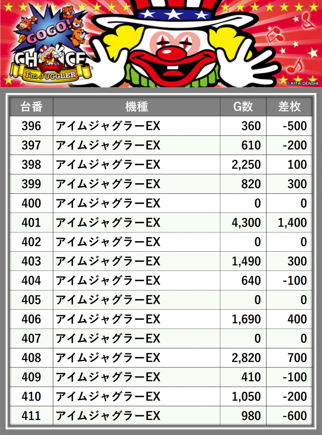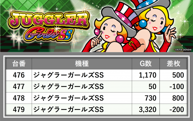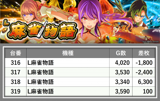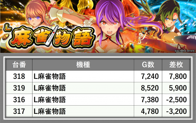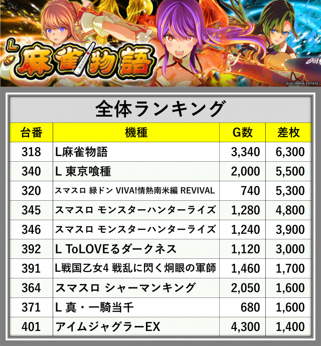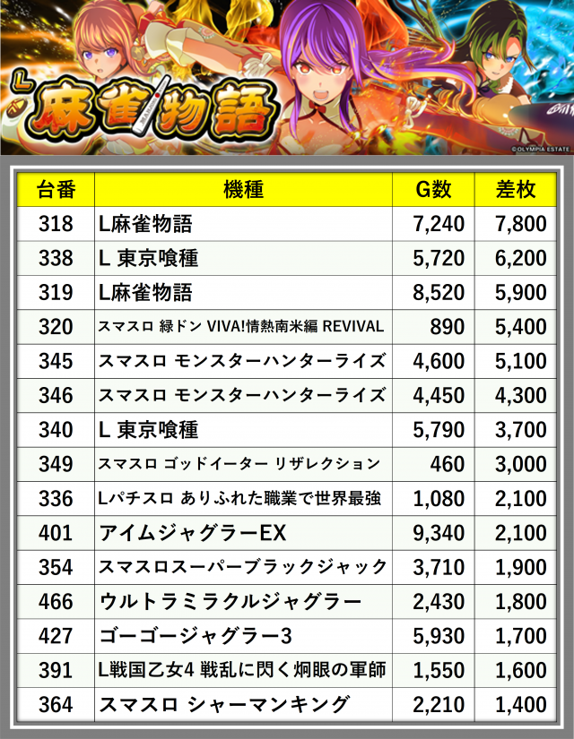 厳選された取材対象機種をはじめ、その他スロット全体から好記録が飛び出した!プレイヤーが楽しんだ1日を下記データにて振り返ってみて欲しい。