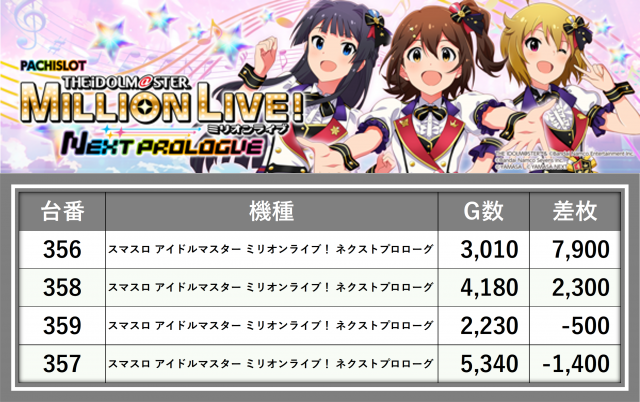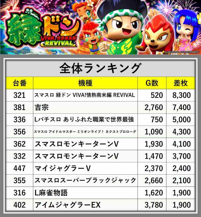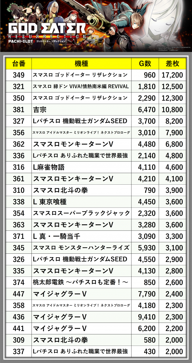 厳選された取材対象機種をはじめ、その他スロット全体から好記録が飛び出した!プレイヤーが楽しんだ1日を下記データにて振り返ってみて欲しい。