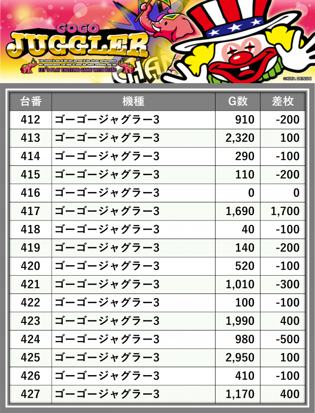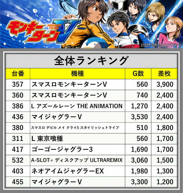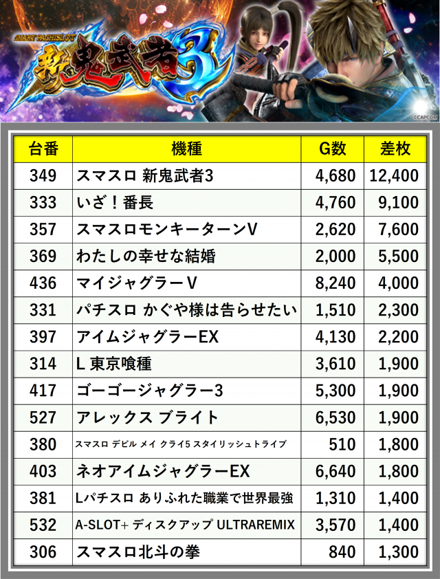 厳選された取材対象機種をはじめ、その他スロット全体から好記録が飛び出した!プレイヤーが楽しんだ1日を下記データにて振り返ってみて欲しい。