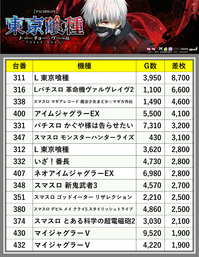 厳選された取材対象機種をはじめ、その他スロット全体から好記録が飛び出した!プレイヤーが楽しんだ1日を下記データにて振り返ってみて欲しい。