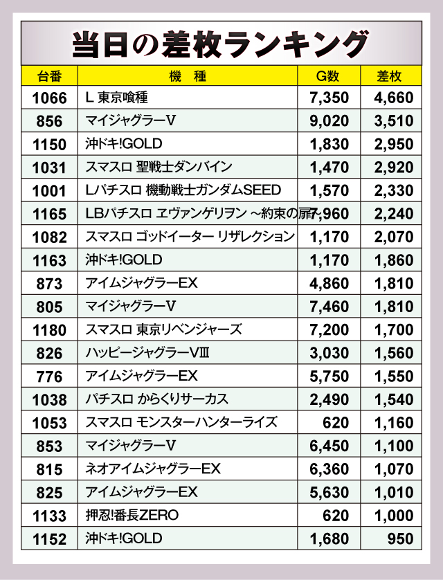 当日の差枚ランキングでは、「L 東京喰種」が+4,660枚で見事トップを獲得。続いて「マイジャグラーV」が+3,510枚、「沖ドキ!GOLD-30」が+2,950枚と続き、スマスロを筆頭にジャグラーシリーズ、沖スロシリーズが上位を分け合う展開に。この多彩な顔ぶれが、当日の盛り上がりを如実に物語っていた。