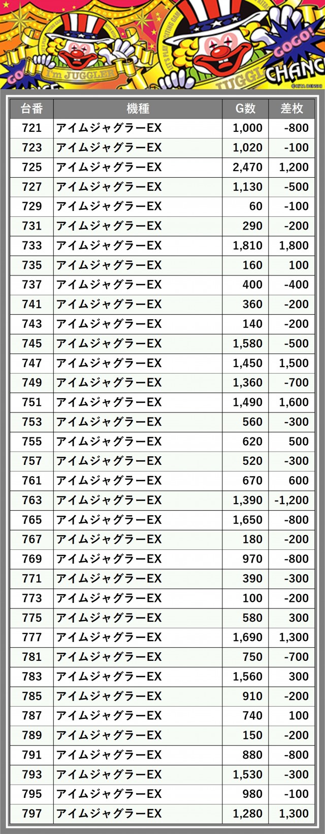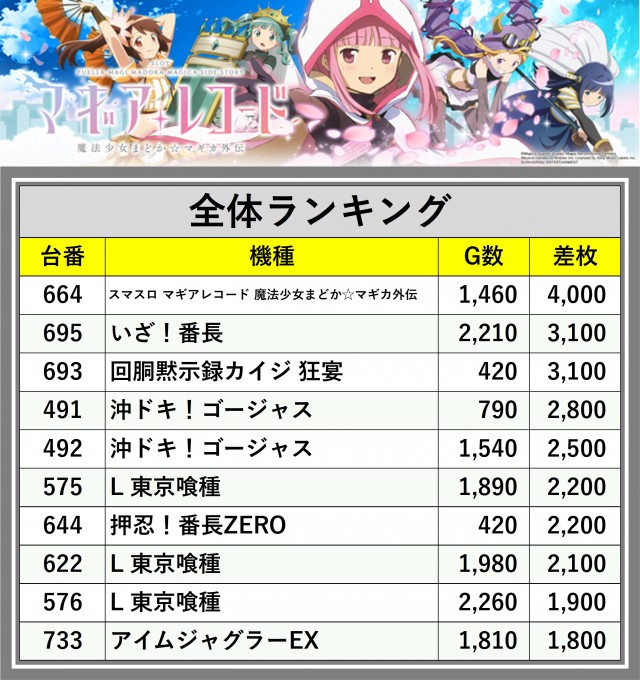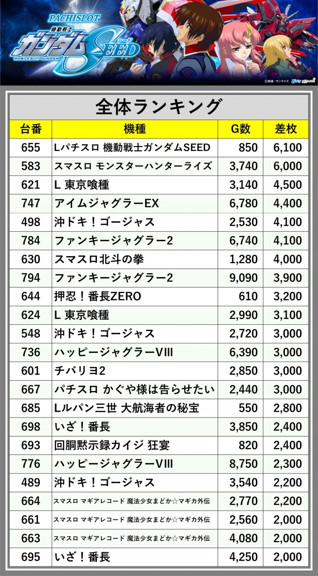 ※差枚数順に掲載しています