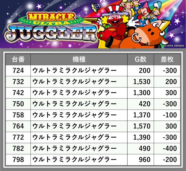 厳選された取材対象機種をはじめ、その他スロット全体から好記録が飛び出した!プレイヤーが楽しんだ1日を下記データにて振り返ってみて欲しい。