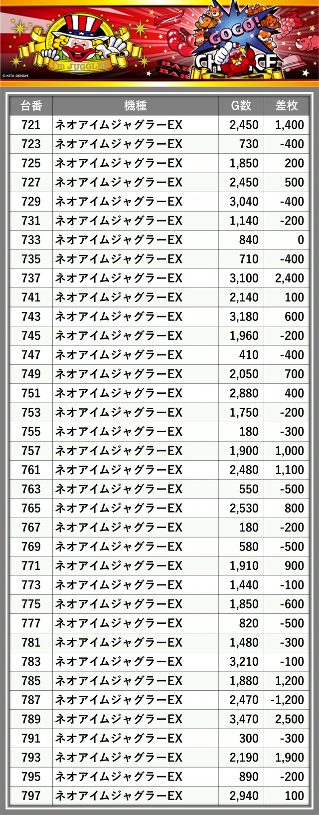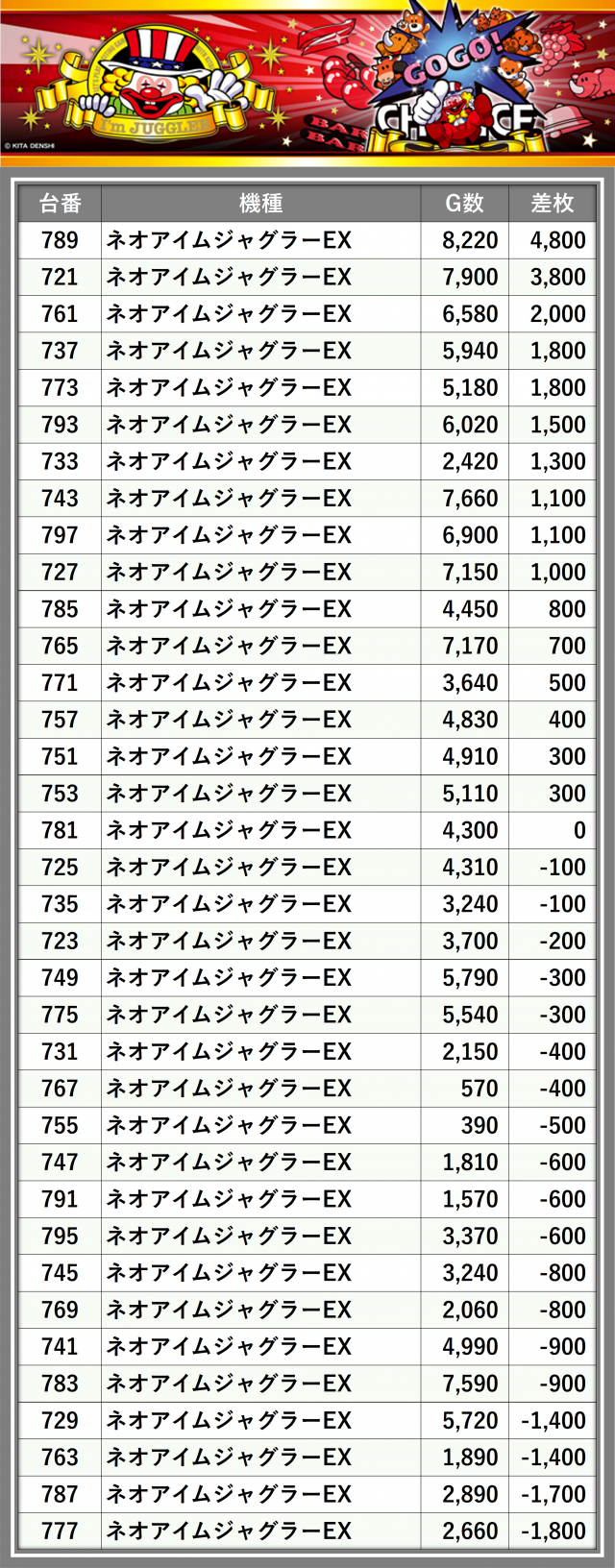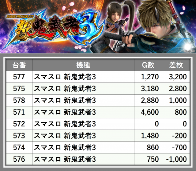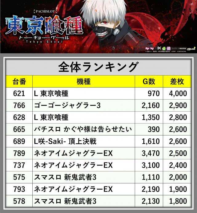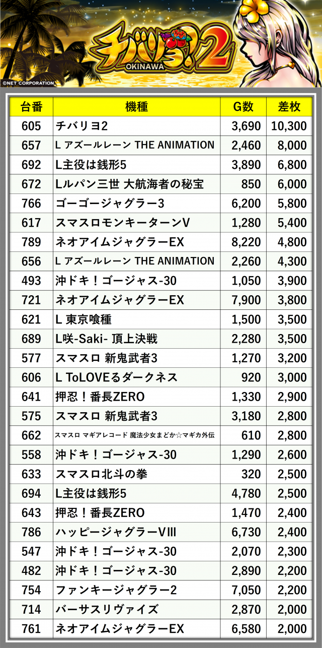 厳選された取材対象機種をはじめ、その他スロット全体から好記録が飛び出した!プレイヤーが楽しんだ1日を下記データにて振り返ってみて欲しい。