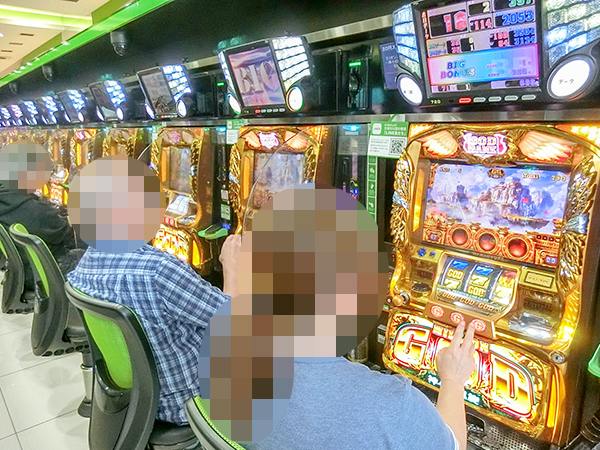 20円パチスロを見てみると、「押忍!番長3」や「ミリオンゴッド-神々の凱旋-」、「アナザーゴッドハーデス-奪われたZEUSver.-」などで、プレイヤーが華麗なパフォーマンスを披露。シマ全体に華やかな光景が広がっていた。