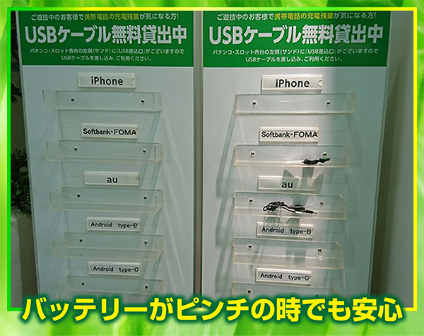 携帯電話の充電用ケーブルの貸し出しも無料でおこなっている。各キャリアに対応できるように、さまざまな種類が用意されているなど、細やかな気配りも好印象だ。