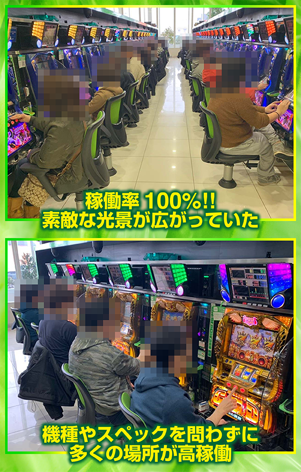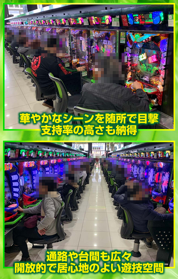 ホール内をのぞいてみると、パチンコとパチスロの両方が盛況。あちこちが活気づいている光景を目にし、厚く支持されている理由も伝わってきた。