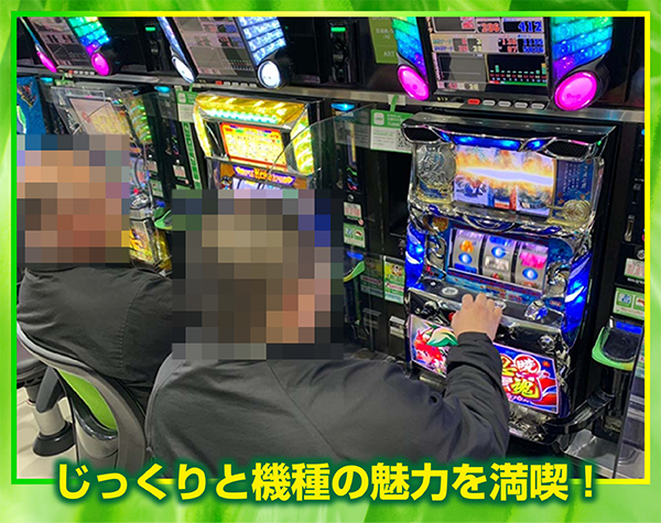 「スーパーリノXX」や「忍魂 〜暁ノ章〜」、ジャグラーシリーズなど、幅広いスペックの機種が楽しまれており、明るい雰囲気が感じられた。